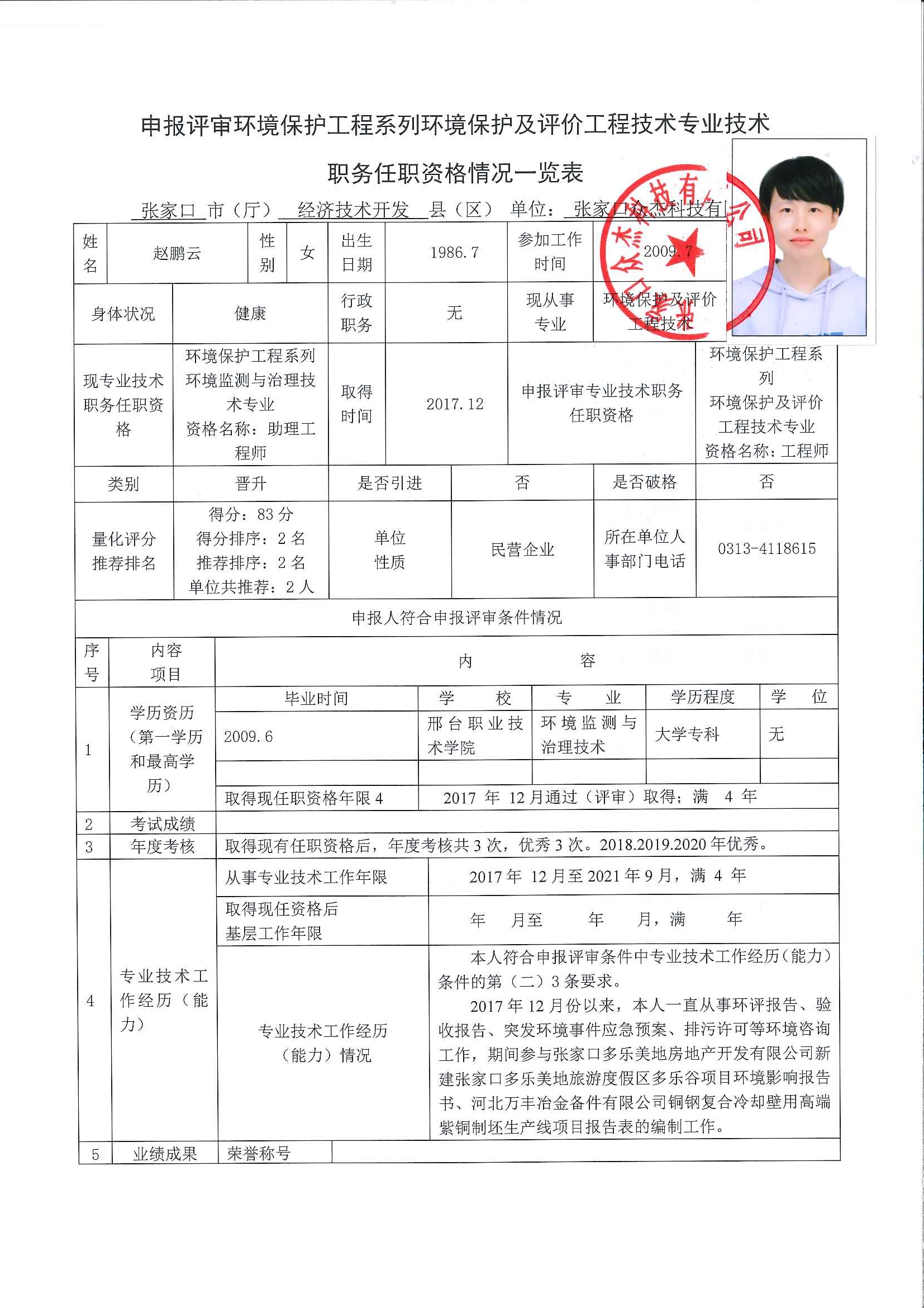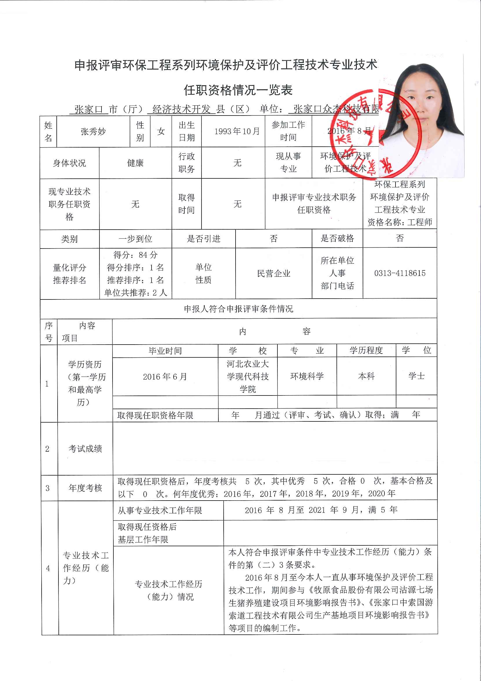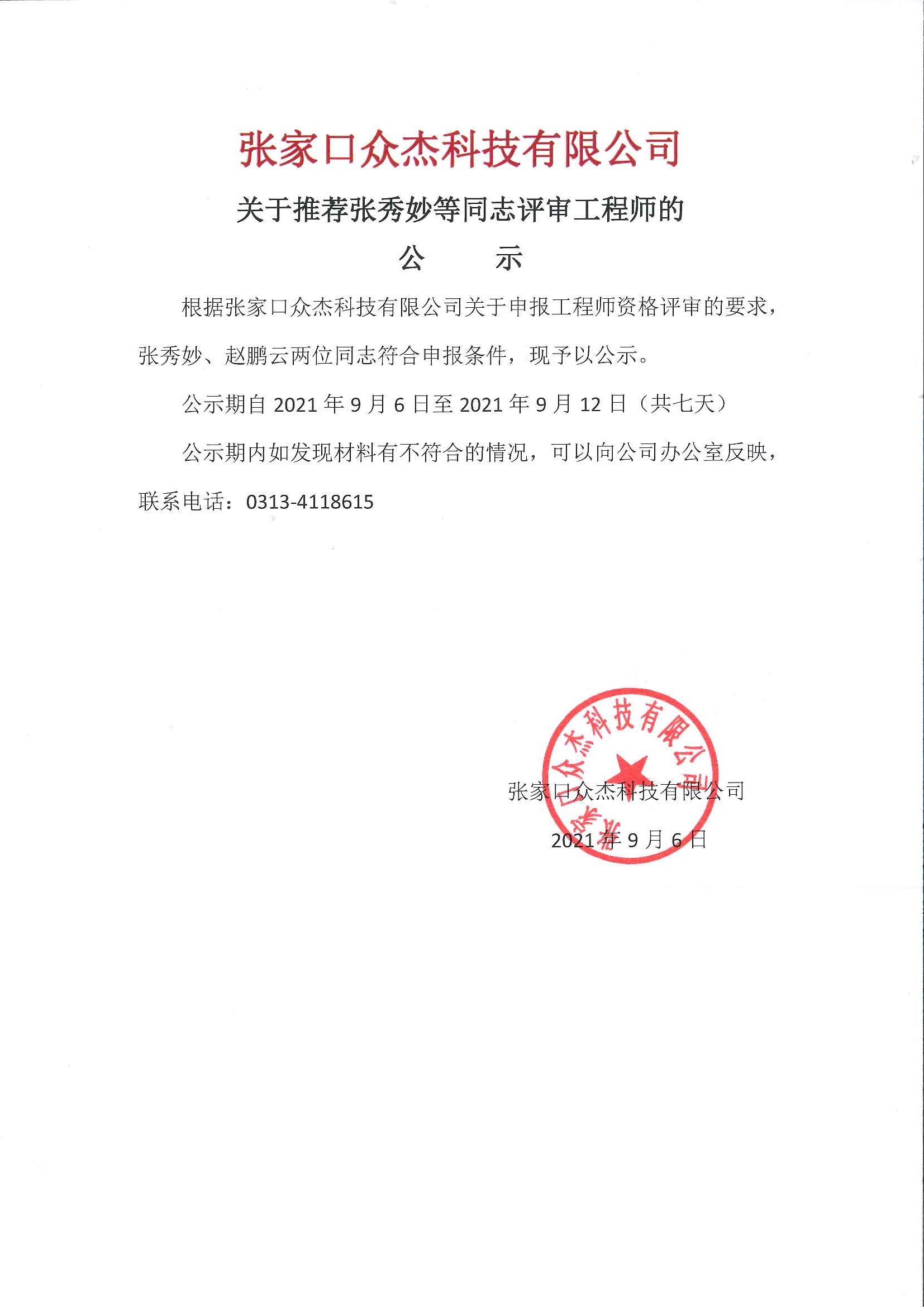 根據張家口眾杰科技有限公司關(guān)于申報工程師資格評審的要求,張秀妙、趙鵬云兩位同志符合申報條件,現予以公示。